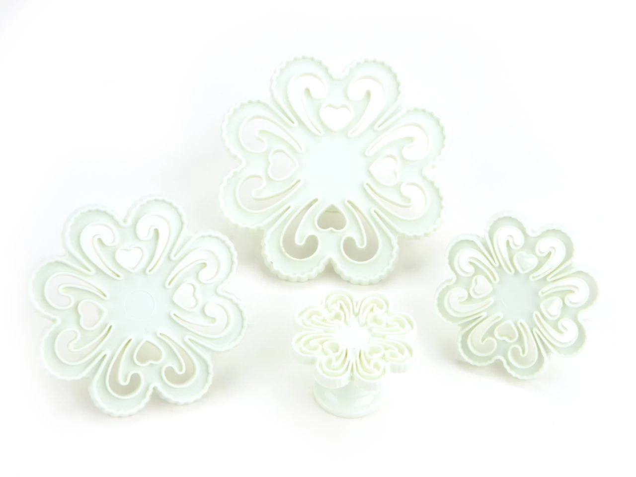 Für Plätzchen, Fondant, Blütenpaste, Marzipan und Modellierschokolade verwenden Sie das Ausstecher-Set Herzkleeblatt aus Kunststoff im 4er-Set mit einem Durchmesser von 4,5 cm, 6 cm, 7,6 cm sowie 9 cm.