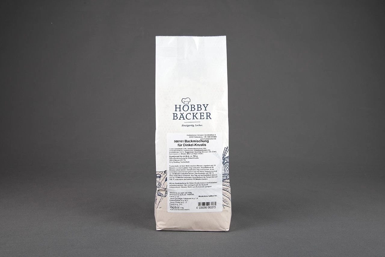 Die Backmischung für Dinkel-Krustis enthält 70 % Dinkelmehl, 10 % Dinkelvollkornschrot sowie Sonnenblumenkerne und Goldleinsamen.