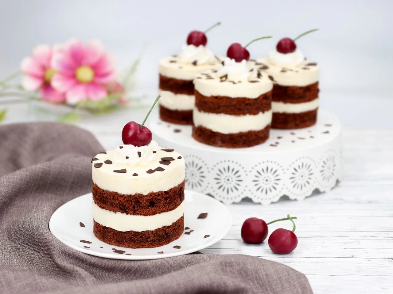 Sie geben der Fertigmischung für Schwarzwälder Kirschtörtchen lediglich zimmerwarme Butter, drei Eier und 100 ml Milch für den Teig hinzu sowie für die Füllung Kirschen aus dem Glas, 115 ml Kirschsaft, 15 g Speisestärke, 20 g Zucker, 125 ml Wasser und 500 g Sahne.