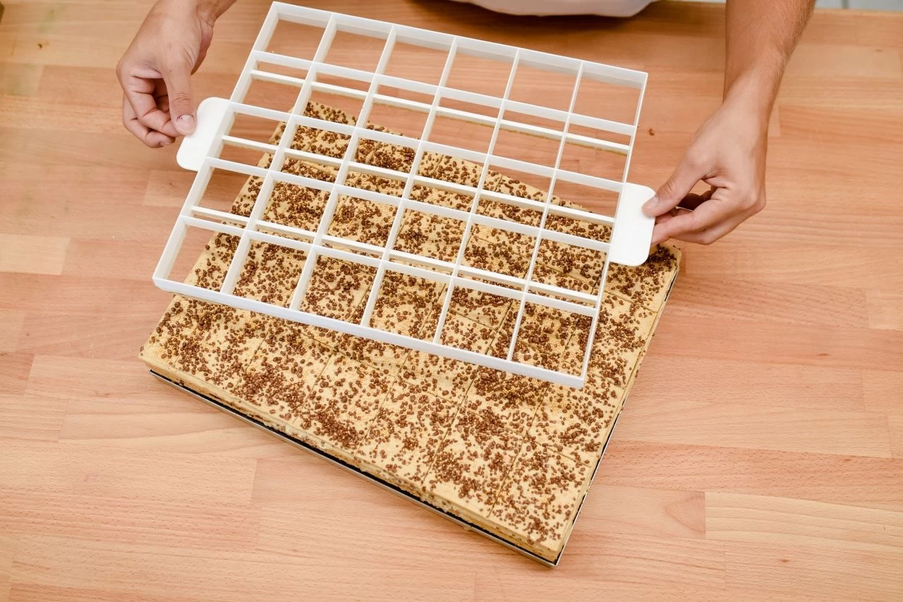 Blechkuchen wirken optisch besonders gelungen, wenn alle Stücke gleich groß sind. Legen Sie sich deshalb diesen Helfer zum Einteilen und Markieren von Sahneschnitten und Blechkuchen sowie zum Schneiden von Plunder- und Blätterteig zu. Es ergeben sich 24 oder 30 Stücke. Maßeinheiten auf beiden Seiten helfen beim Gebrauch. Aus Kunststoff, spülmaschinenfest.