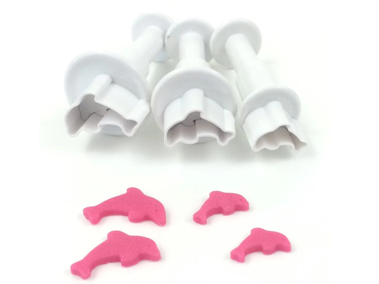 Nutzen Sie das praktische Mini-Ausstecher-Set mit Stempel Delfin im 3er-Set von dekofeefür Ihre Dekoration Ihrer Paradiestorte in verschiedenen Größen. Die Ausstechformen aus Kunststoff in Weiß verfügen über eine Stempelfunktion, die Plätzchenteig, Fondant, Marzipan und Modellierschokolade zusätzlich prägt.