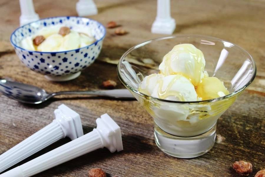 Bitte beachten Sie die maximale Herstellmenge Ihrer Eismaschine. Ist der Behälter zu voll, bleibt kein Platz für Luft – und die ist notwendig, damit Ihr Eis eine zarte Konsistenz erhält.
