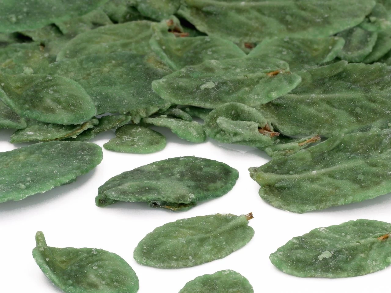 Nach der Ernte werden die Pfefferminzblätter entstielt, gewaschen und getrocknet. Zuckersirup und feinster Puderzucker kandieren die Minzeblätter. Nach dem Trocknungsverfahren auf feinen Gitternetzen sind die essbaren Blätter bei kühler, trockener Lagerung lange haltbar.