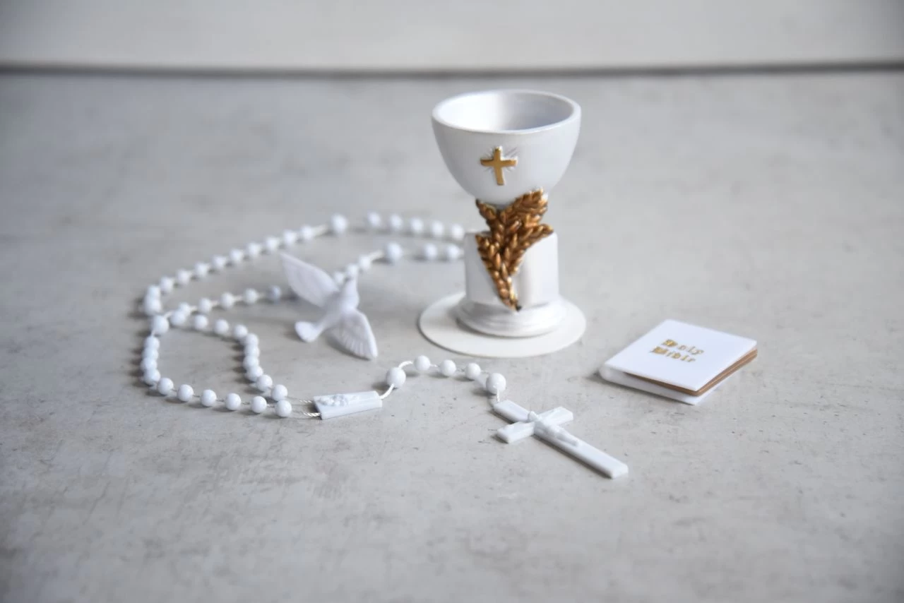 Die Kommunion ist für viele Kinder ein wichtiger Schritt im Leben – und selbst im hohen Alter vergessen die meisten Menschen diesen einzigartigen Tag nicht. Das Bekenntnis zum Glauben und zu Gott wird auch hierzulande gebührend gefeiert und was eignet sich besser an diesem unvergesslichen Tag als eine stimmige Kommunionstorte. Unser Tortendeko-Set „Motivtorte Kommunion“ bietet alles, was Sie zur Feier der heiligen Kommunion benötigen. Es besteht aus einem Kelch, einem Rosenkranz, einer Bibel und einer Taube. Somit verwandelt es selbst eine simple Torte in eine ausdrucksstarkes Kommunionstorte. Es besteht aus Kunststoff und kann auf so ziemlich jedem Untergrund verwendet werden. Somit sorgt es im Handumdrehen für ein gelungenes Gesamtbild und macht aus Hobbybäcker gekonnte Konditoren. Suchen Sie noch mehr Dekorationen rund um dieses Fest? Dann sollten Sie in unsere Kategorie „Kommunion & Konfirmation“ vorbeischauen.