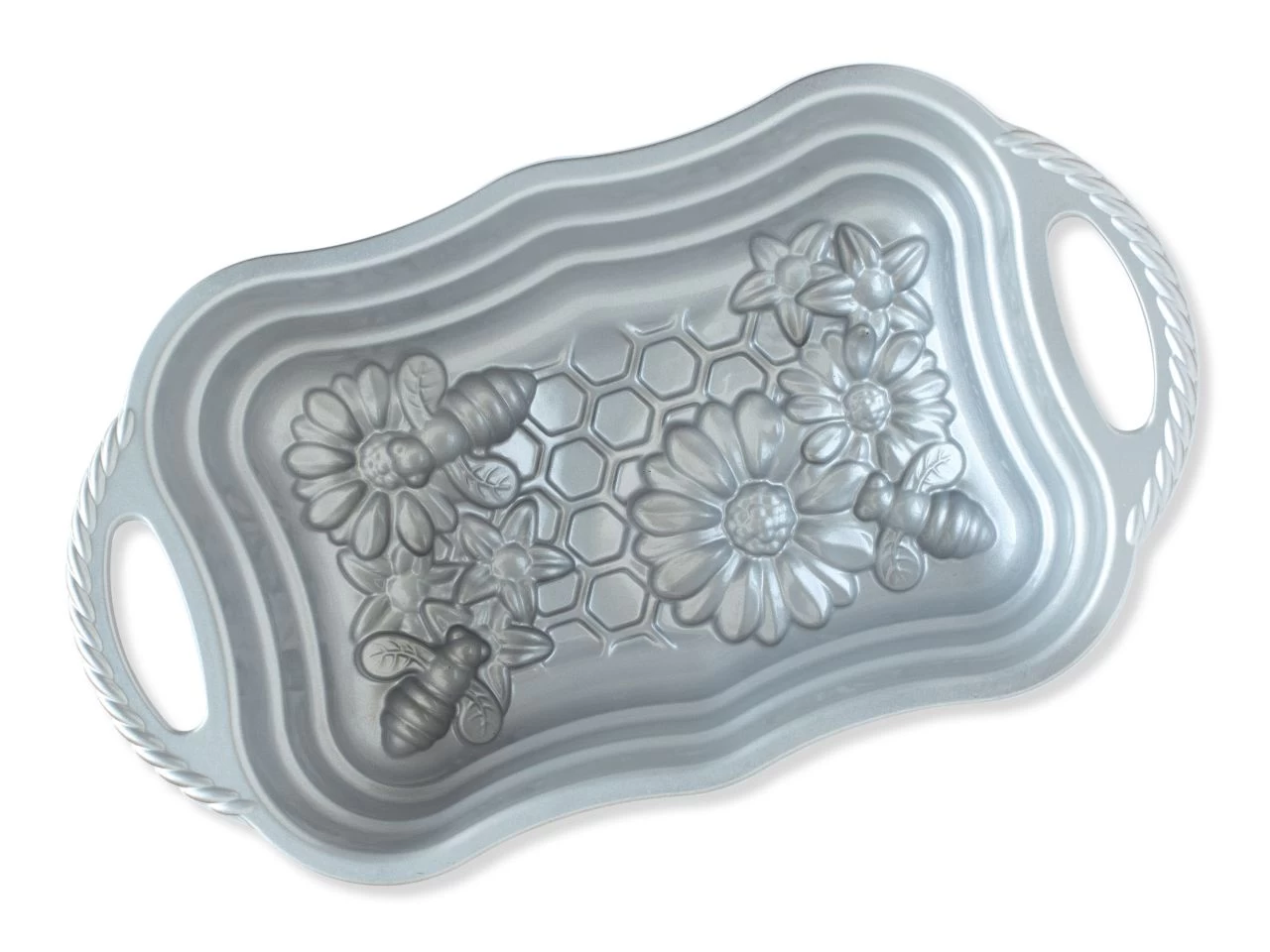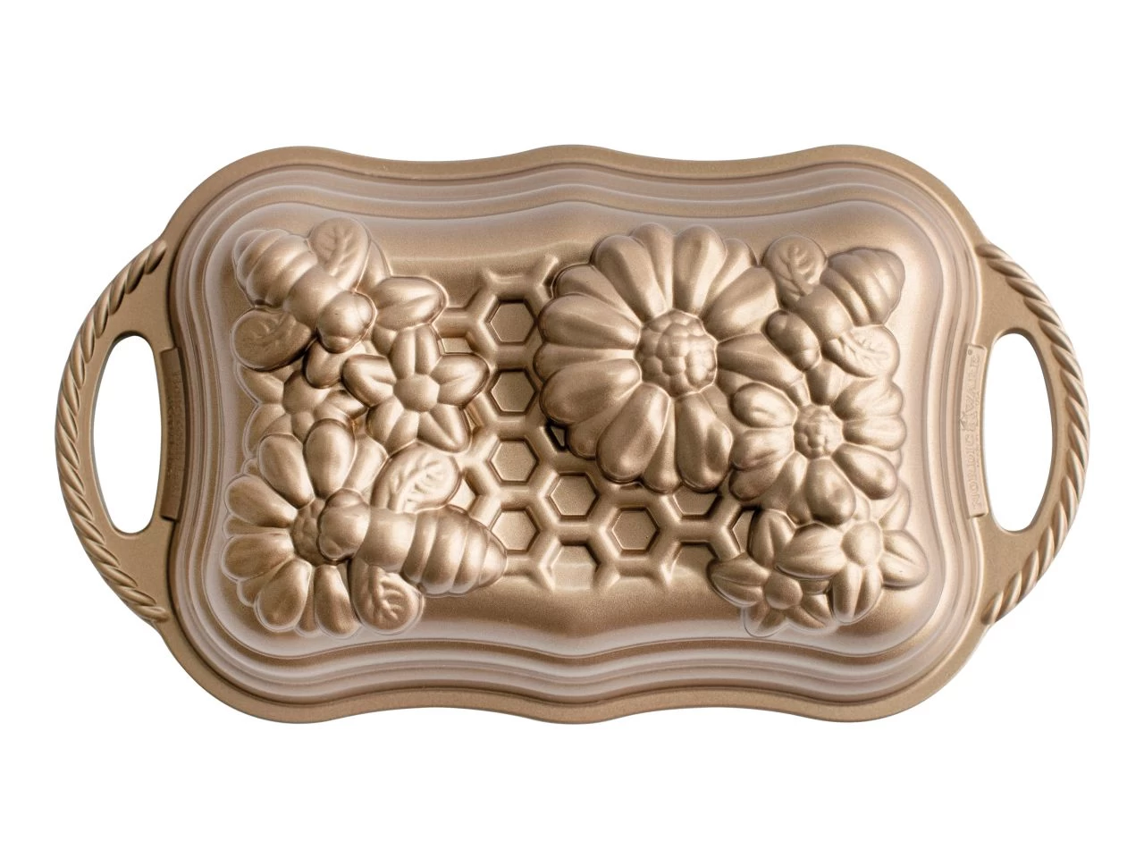 Mit der kupferfarbene Nordic Ware Aluguss-Backform Honeycomb Loaf holen Sie sich einen Profi aus einem Aluminiumguss ins Haus. Die extra schwere Kuchenform mit der Größe 21,5 cm x 14,5 cm und einer Höhe von 7 cm hat ein Volumen von 1,4 Litern. Mit dieser originellen 3D-Backform aus Aluguss backen Sie einen Kuchen mit Bienenwaben- und Blütenmuster.