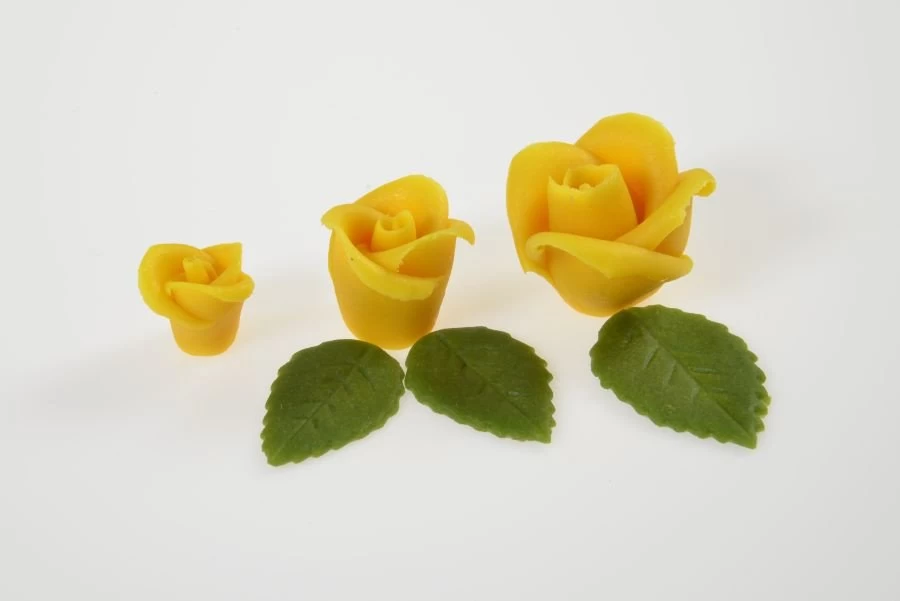 Marzipanrosen in gelb setzen Ihrer Festtagstorte eine märchenhafte Krone auf. Inhalt: 9 Rosen, 14 Blätter.