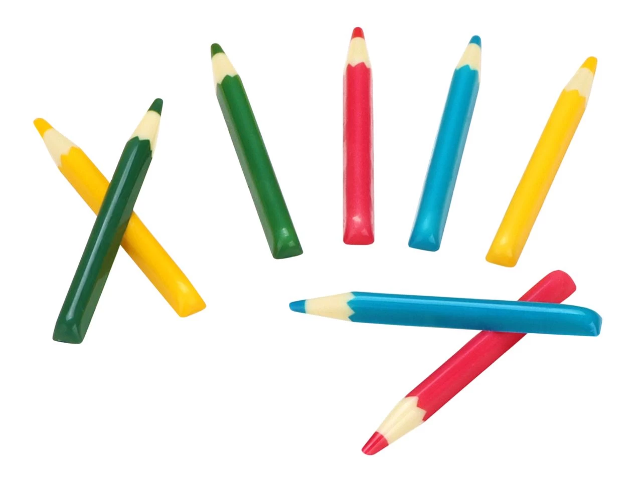 Geliefert werden die Stifte aus weißer Schokolade in Gelb, Rot, Blau und Grün. Sie passen perfekt zu Kindergeburtstagen und Einschulungen.
