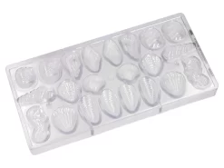 Der Kunststoff dieser Pralinenform besteht aus Polycarbonat und wurde für den dauerhaften Einsatz entwickelt. Die Profi-Pralinenform wird, falls nötig, ausschließlich in klarem, warmem Wasser gereinigt und ggf. vor dem nächsten Gebrauch mit etwas Watte poliert.