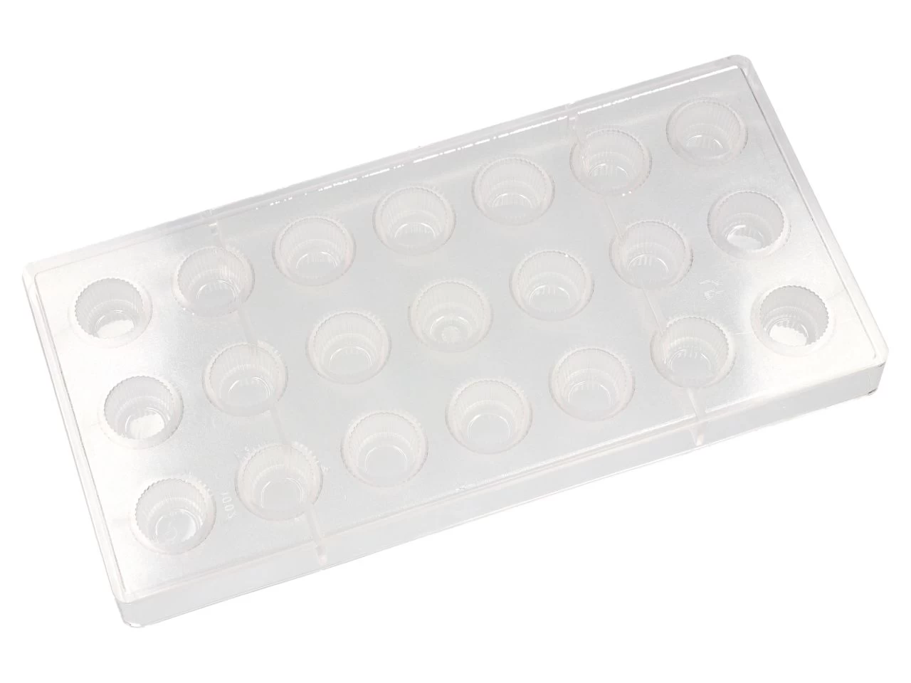 Der Kunststoff dieser Pralinenform besteht aus Polycarbonat und wurde für den dauerhaften Einsatz entwickelt. Die Profi-Pralinenform wird, falls nötig, ausschließlich in klarem, warmem Wasser gereinigt und ggf. vor dem nächsten Gebrauch mit etwas Watte poliert.