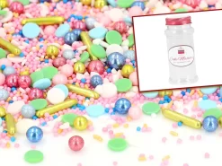 Verzieren Sie mit den stilvollen Sprinkles Sweet Surprise in Rosa, Blau, Blau-Metallic, Rot-Metallic, Grün und Golden zu 80 g Muffins, Kuchen, Cupcakes und Plätzchen. Die Zuckerstreusel-Mischung enthält Nonpareilles, Zuckerkugeln, Zuckerherzen und Zuckerstäbchen, um das Kuchenbuffet auf jeder Überraschungsparty zu verschönern. Jetzt umweltfreundlich mit eigener Vorratsdose.