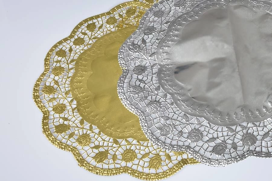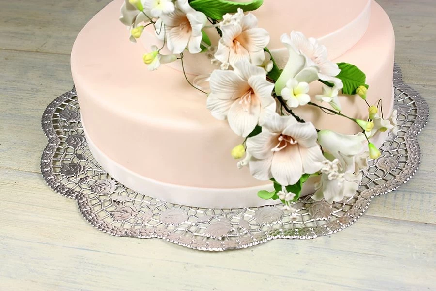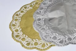 In modernem Silberton passen die zarten Tortenspitzen zu vielen Arrangements. Ergänzen Sie diese Tischdekoration mit einem farblich passenden Dekorband zu einem harmonischen Ensemble.