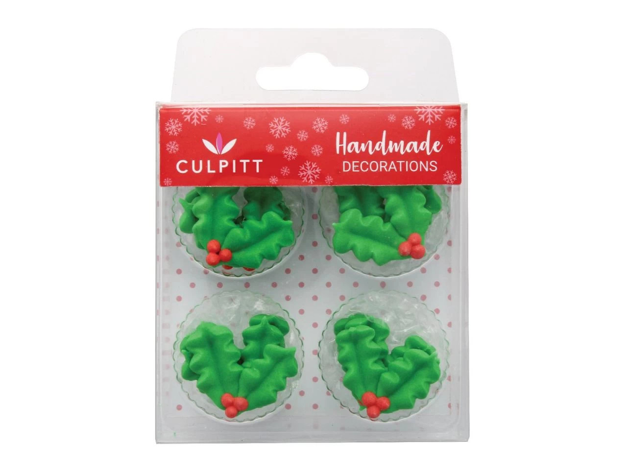 In Handarbeit hergestellte, weihnachtliche Zuckerdekoration in Form von Ilexblättern. Sie erhalten 12 Zuckerdekore im Set. Der Durchmesser beträgt je ca. 2,0cm.